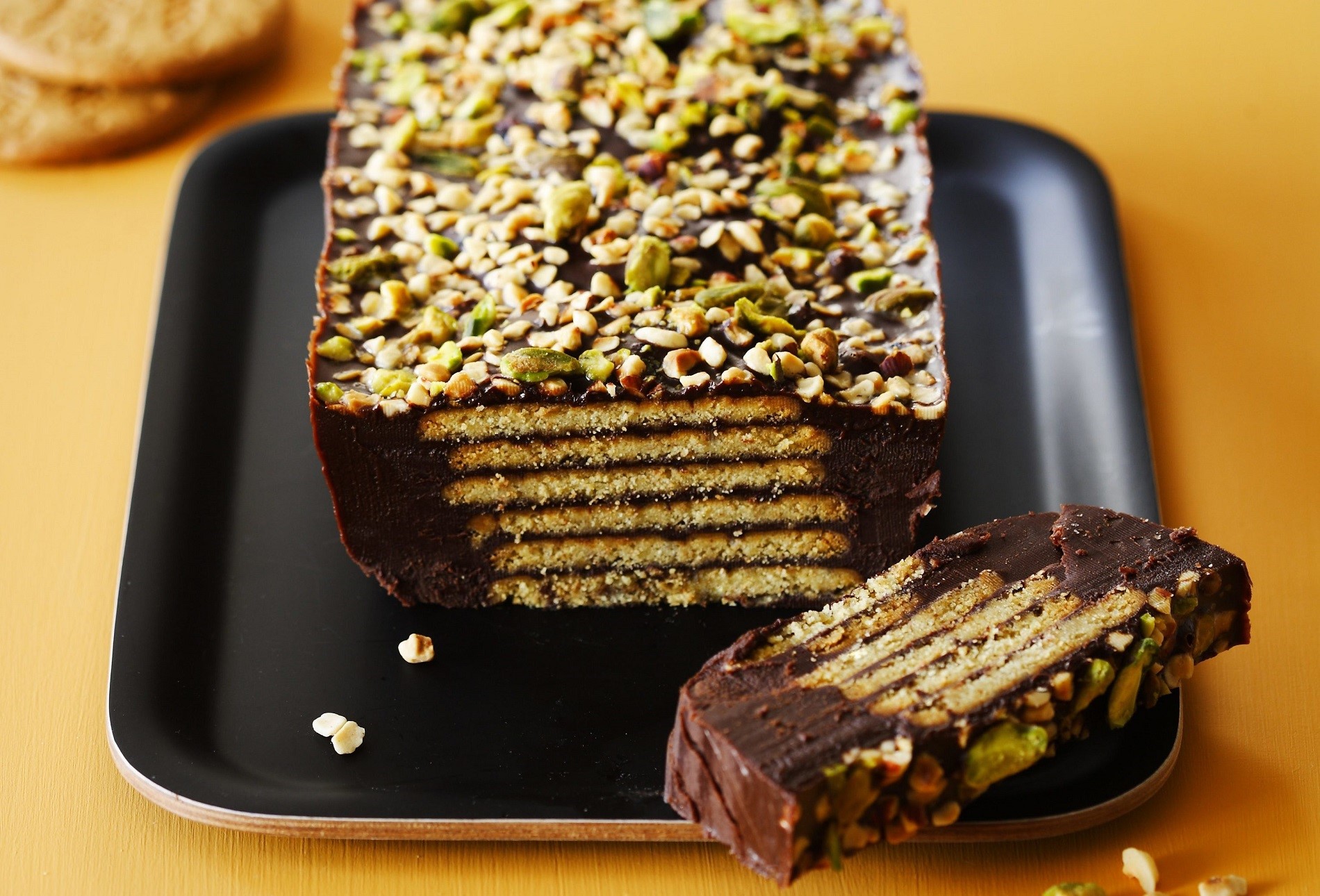 روی قالب را با سلفون بپوشانید و به مدت ۲۴ ساعت در یخچال قرار دهید تا مواد کاملا به خرد بیسکویتها برود و بافت آن نرم و خوشمزه شود.