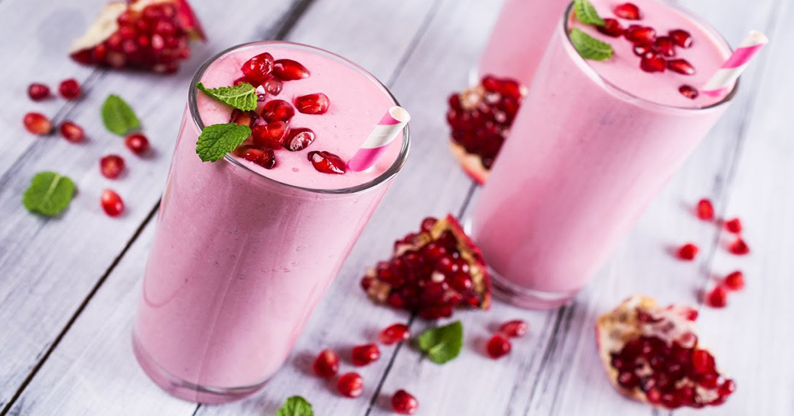 سرو اسموتی: مخلوط آمادهشده را در لیوانهای شفاف بریزید و با دانههای انار و برگ نعنا تزئین کنید.