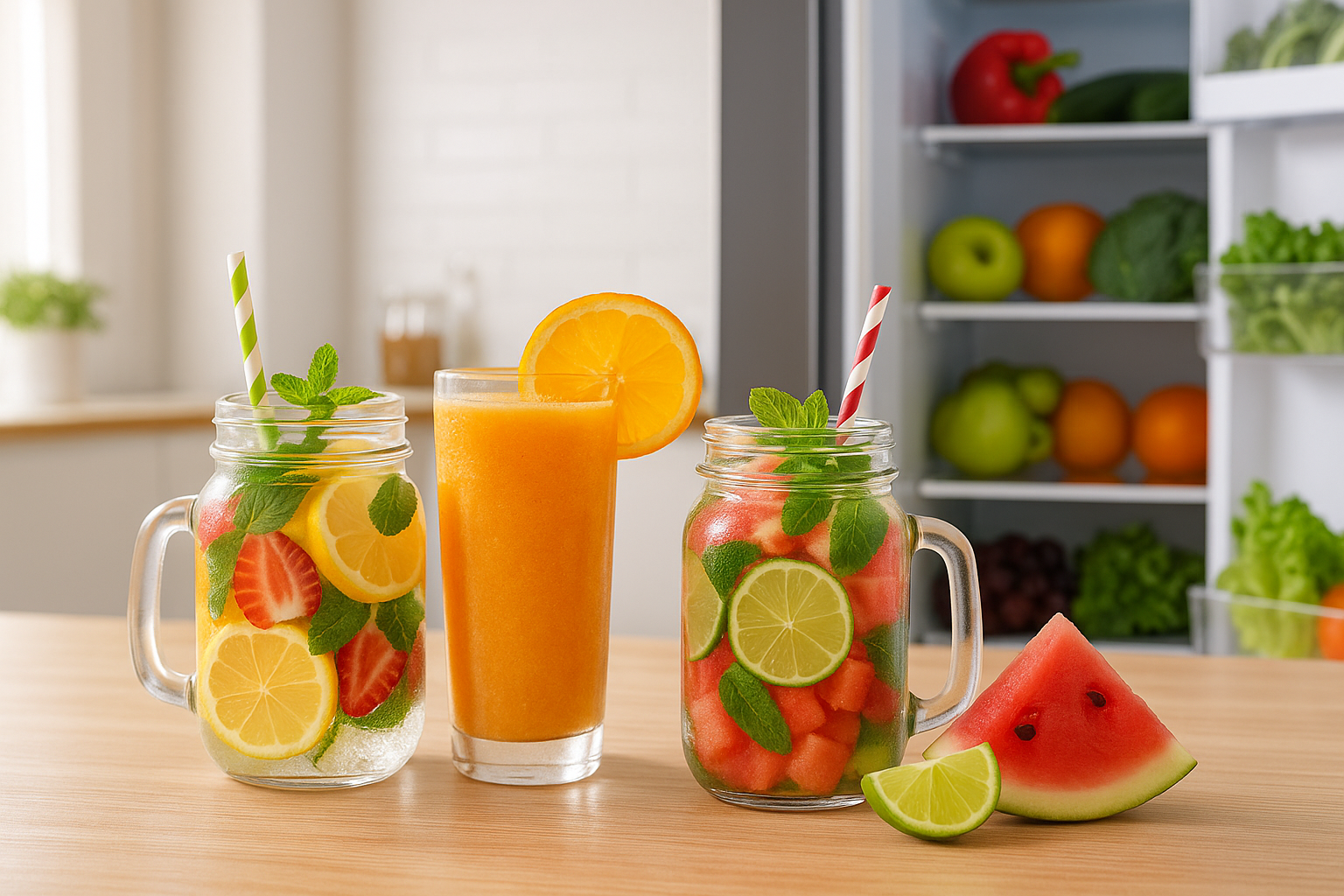 هندوانه یکی از میوههای فصلی اردیبهشت است که سرشار از آب، آنتیاکسیدان و ویتامینهای مفید است. برای تهیه این نوشیدنی، کافیست چند قاچ هندوانه را با برگ نعناع تازه و کمی آبلیمو در مخلوطکن بریزید. میتوانید با افزودن چند تکه یخ، طعم آن را خنکتر و مطبوعتر کنید.