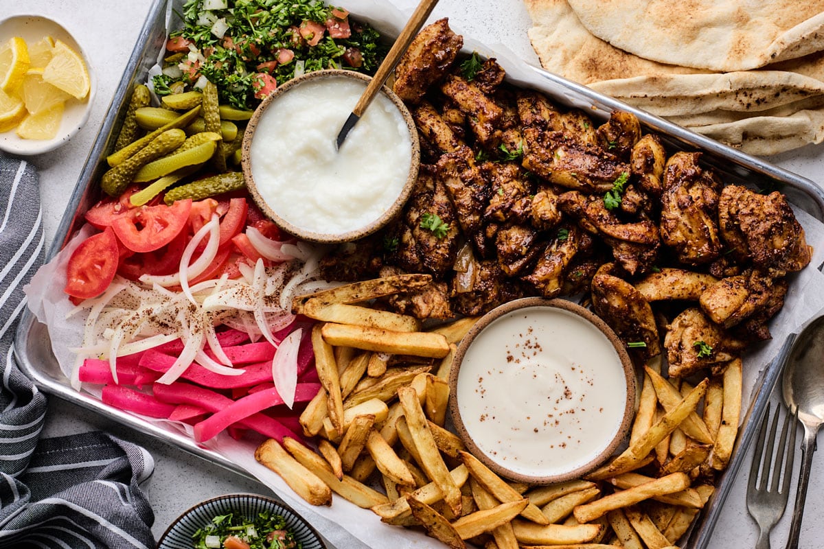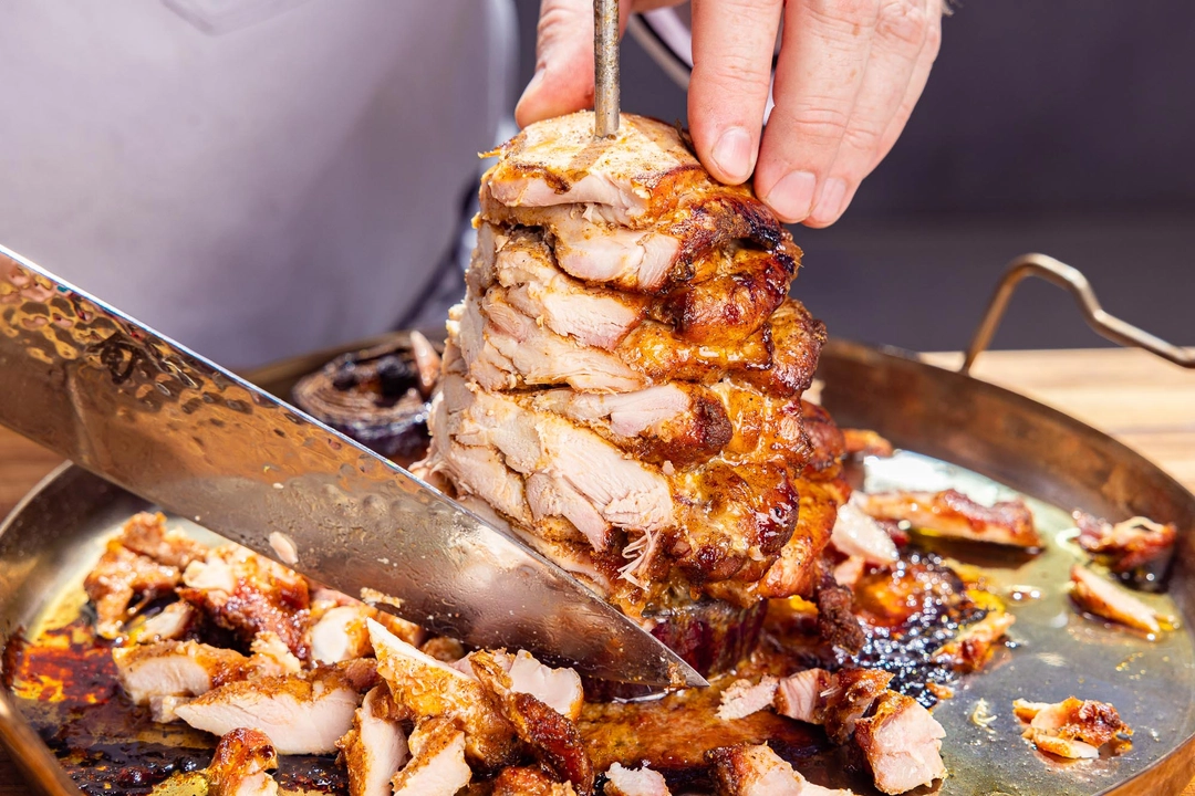 شاورمای مرغ یک غذای اصلی خاورمیانه‌ای و غذای خیابانی محبوبی است که برای پخت آهسته یک تکه بزرگ گوشت روی یک سیخ عمودی تهیه می‌شود. سرآشپزها برش‌های نازکی از گوشت را از لبه بیرونی تراشیده و به سرو می‌کنند.