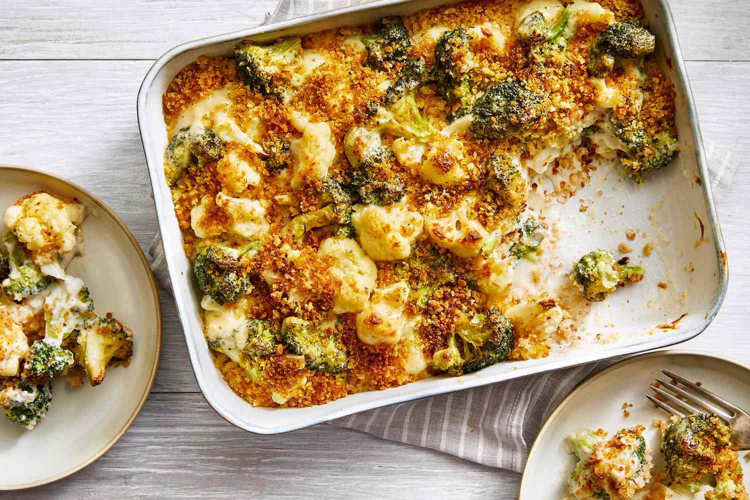 بروکلی و گل کلم پخته شده را به سس اضافه کرده و خوب مخلوط کنید تا سبزیجات به طور کامل با سس پوشانده شوند. اکنون باید مخلوط را به یک ظرف کاسرول که با روغن زیتون یا کره چرب شده، انتقال دهید. پر نهایت نیز اگر از پودر نان یا پودر بیسکویت استفاده می‌کنید، آن را به طور یکنواخت روی مخلوط بریزید.
